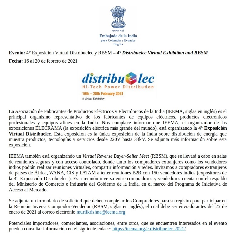 Indian Electrical and Electronics Manufacturers’ Association (IEEMA), is the apex representative body of manufacturers of electrical equipment, professional electronics and allied equipment in India. IEEMA, the organiser of ELECRAMA exhibitions (World's largest electrical exhibition), is organizing the 4th Distribuelec virtual exhibition, scheduled from 16th to 20th February 2021. This exhibition is India's only exposition on Power Distribution, showcasing products, technologies and services from 220V till 33kV. More information on this exhibition is attached.