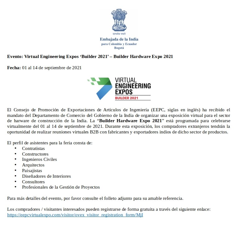 EEPC INDIA has been mandated by the Department of Commerce, Government of India, to organize another Virtual exposition for the Indian Builder Hardware Sector. “Builder Hardware Expo 2021” is scheduled to be held virtually from 01-14 September 2021. During this exposition overseas buyers will have an opportunity of doing virtual B2B meetings with Indian manufacturers and exporters of the said product sector.