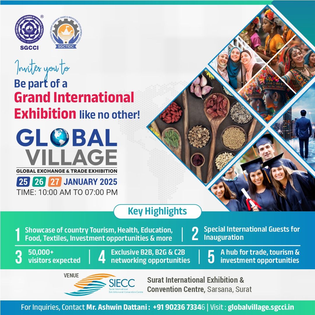 The Southern Gujarat Chamber of Commerce & Industry (SGCCI) is inviting to the Global Village Exhibition 2025, scheduled from January 25 to 27, 2025, at the Surat International Exhibition and Convention Centre (SIECC), Surat, Gujarat, India.