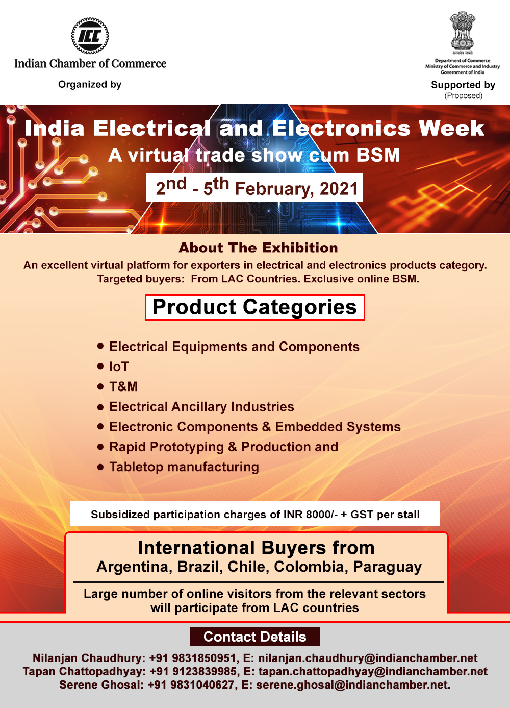 ICC with the active support of the Ministry of Commerce & Industries, Government of India, would be conducting Virtual Trade fair for Indian manufacturers and exporters to connect with the potential buyers from Latin American countries as per the details below.