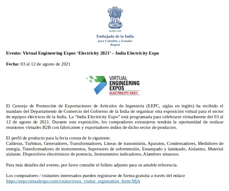 EEPC INDIA has been mandated by the Department of Commerce, Government of India, to organize yet another Virtual exposition for the Indian Electrical Equipment Sector. “India Electricity Expo” is scheduled to be held virtually from 27-30 September 2021. During this exposition overseas buyers will have an opportunity of doing virtual B2B meetings with Indian manufacturers and exporters of the said product sector.