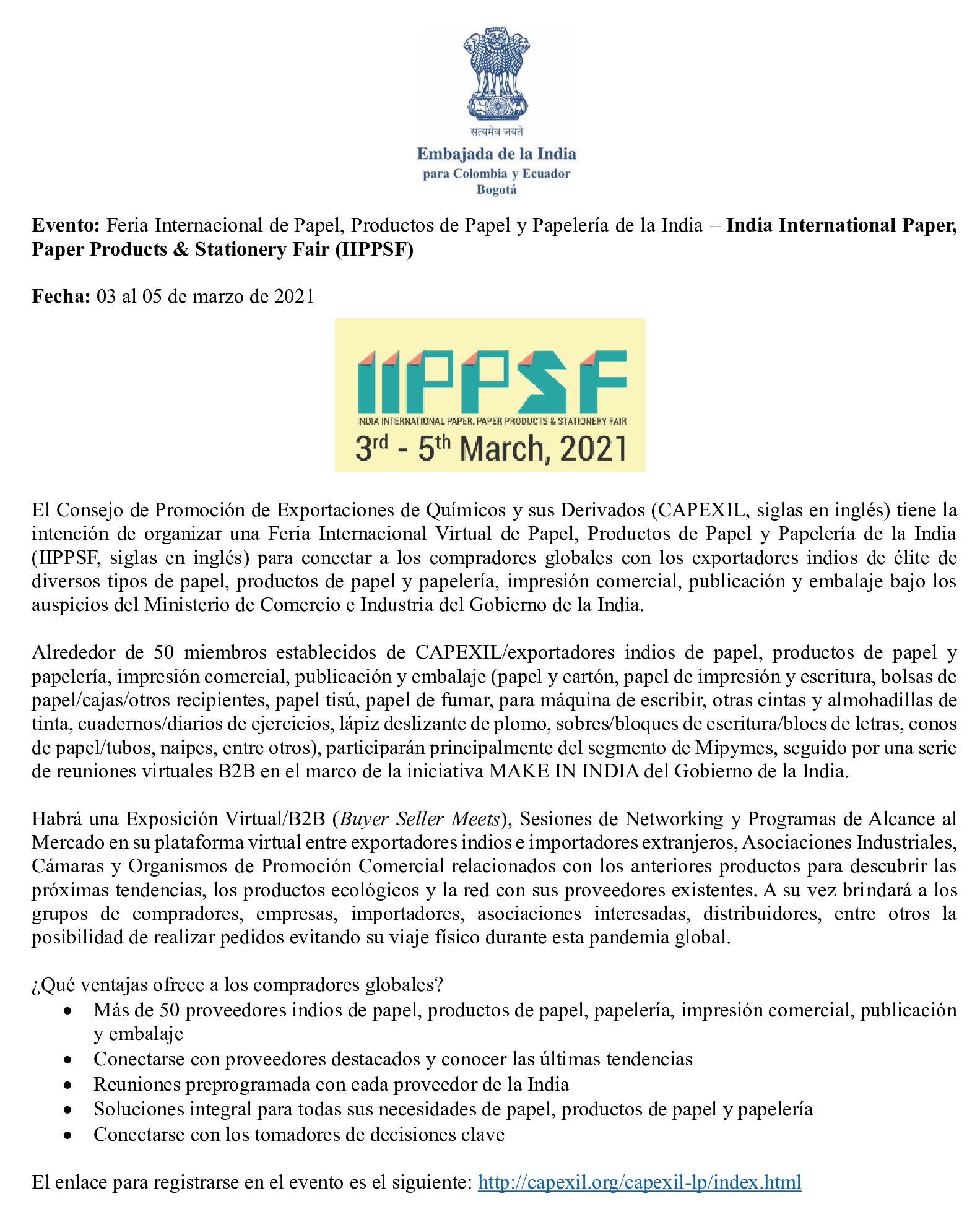 CAPEXIL is organizing a Virtual IIPPSF-India International Paper, Paper Products & Stationery Fair from 3 to 5 March 2021 to connect global Buyers with the elite Indian Exporters of various Paper, Paper Products & Stationery, Commercial Printing, Publishing & Packaging under the auspices of Ministry of Commerce & Industry, Government of India.