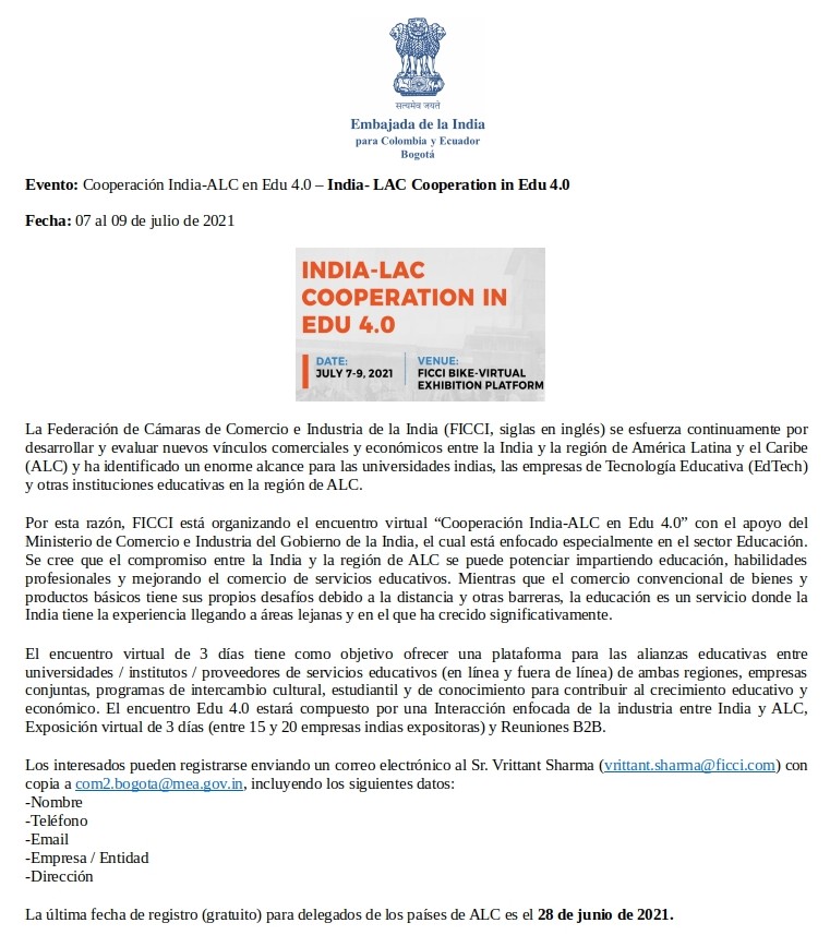 Keeping this approach in mind, the 3-day “India- LAC Cooperation in Edu 4.0” aims to offer a platform for education alliances between Universities/ institutes/ educational service provider (online-offline both) from both the regions, joint ventures of knowledge, student and cultural exchange programs to contribute towards our educational & economic growth.
