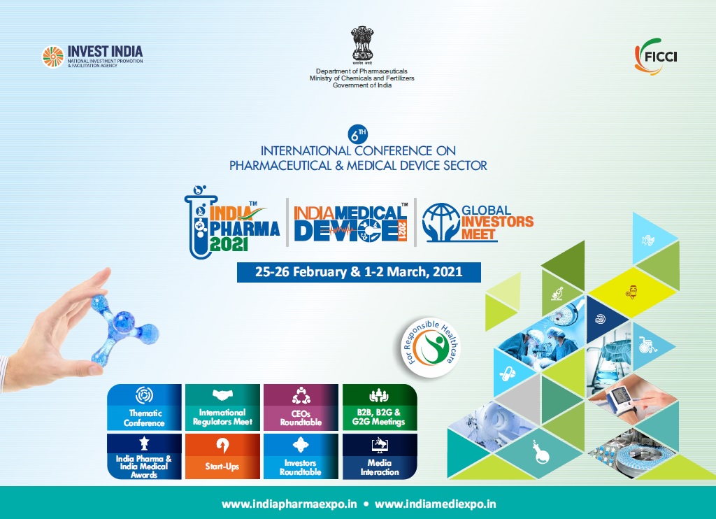 The flagship program of Department of Pharmaceuticals, Ministry of Chemicals & Fertilizers, Government of India, and Federation of Indian Chambers of Commerce & Industry (FICCI), - INDIA PHARMA 2021 & INDIA MEDICAL DEVICE 2021 is scheduled on 25-26 February 2021 & 1-2 March 2021.