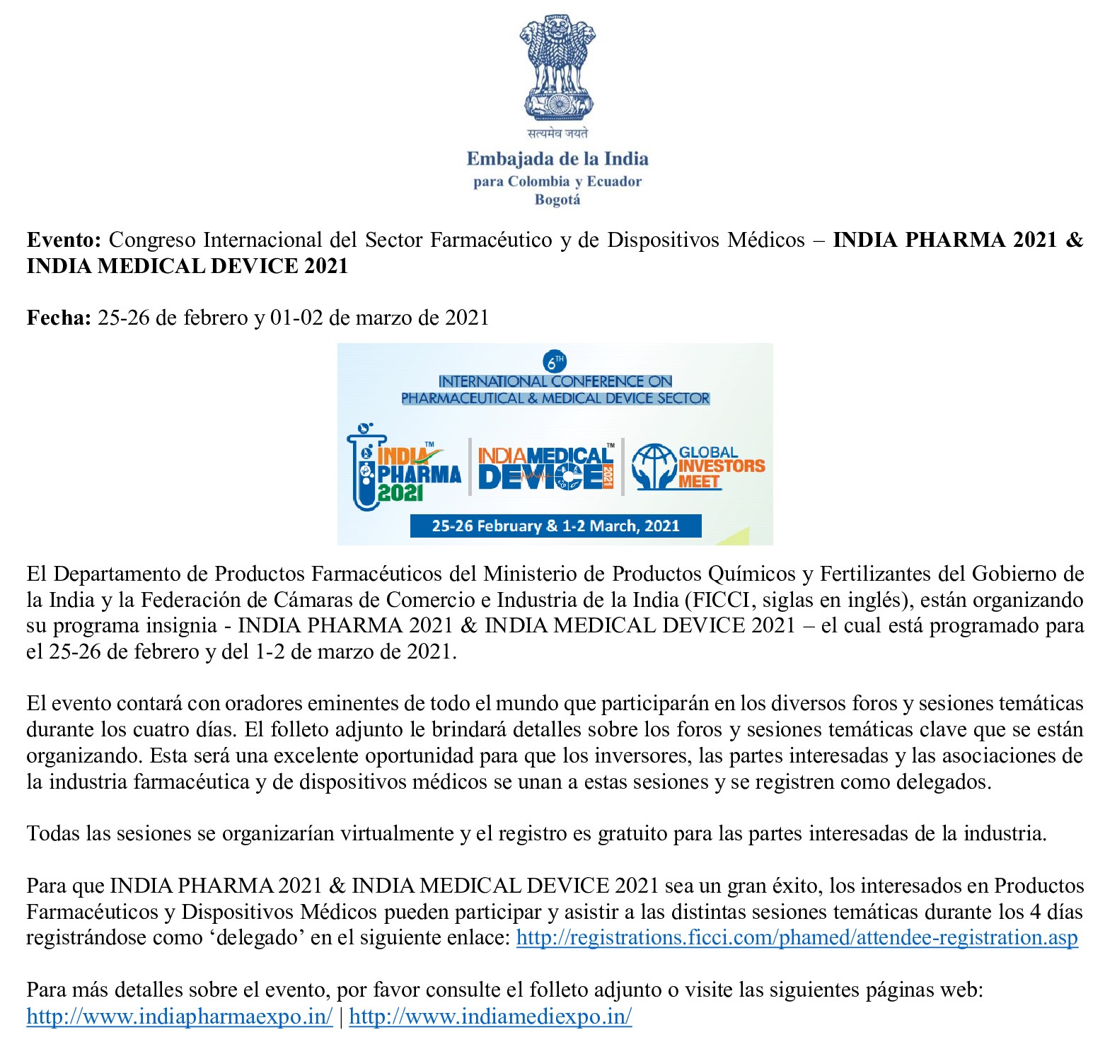 To make INDIA PHARMA 2021 & INDIA MEDICAL DEVICE 2021 a grand success, Investors & Pharmaceuticals & Medical Device industry can participate and Register at the link http://registrations.ficci.com/phamed/attendee-registration.asp as Delegate and attend the various thematic sessions during the 4 days.