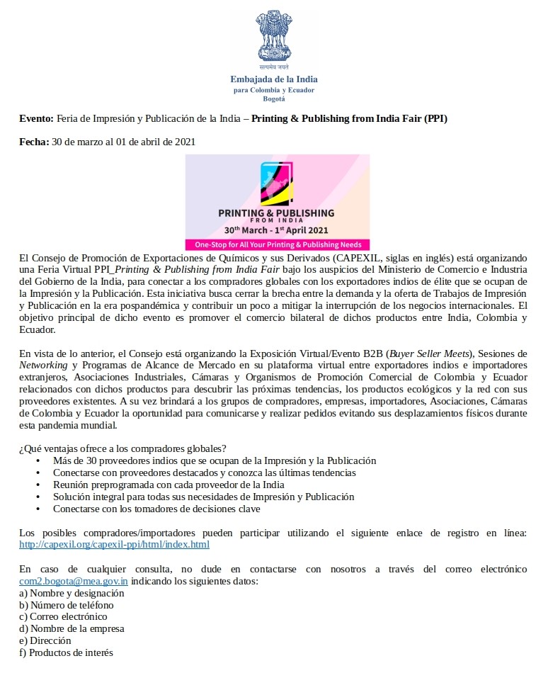 CAPEXIL is organizing a Virtual Fair PPI_Printing & Publishing from India Fair during 30 March to 01 April 2021 under the auspices of the Ministry of Commerce and Industry of the Government of India, to connect global buyers with elite Indian exporters dealing in Printing and Publishing. This initiative seeks to bridge the gap between the demand and supply of Printing and Publishing work in the post-pandemic era and to contribute a bit to mitigate the international business disruption. The prime objective of the said event is to promote bilateral trade in connection to Printing and Publishing work between India & Colombia & Ecuador.