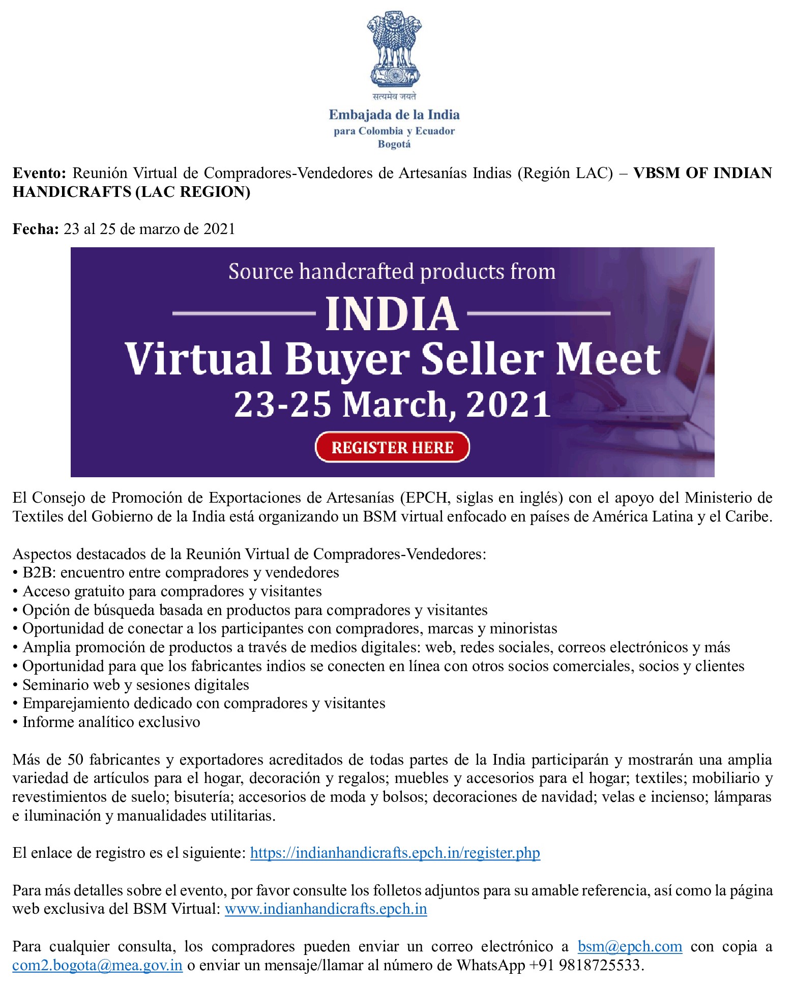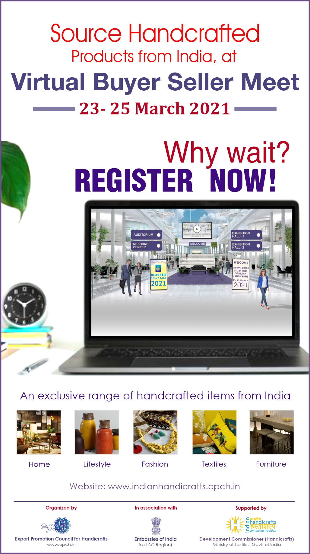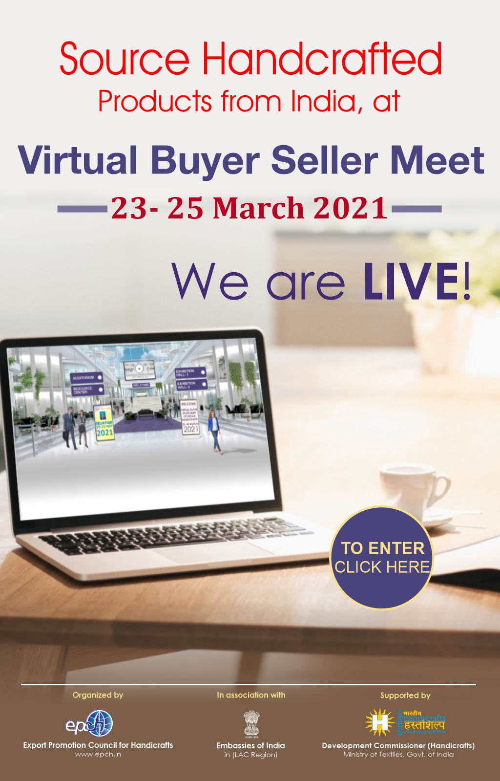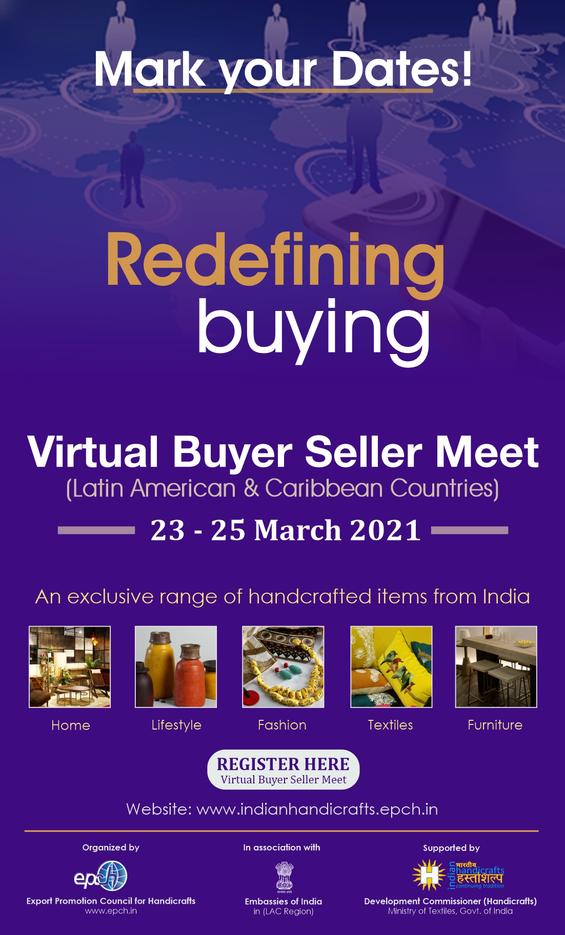 The Export Promotion Council for Handicrafts (EPCH) supported by Ministry of Textiles, Govt. of India is organizing a Virtual BSM focused on Latin American & Caribbean Countries from 23 to 25 March 2021.