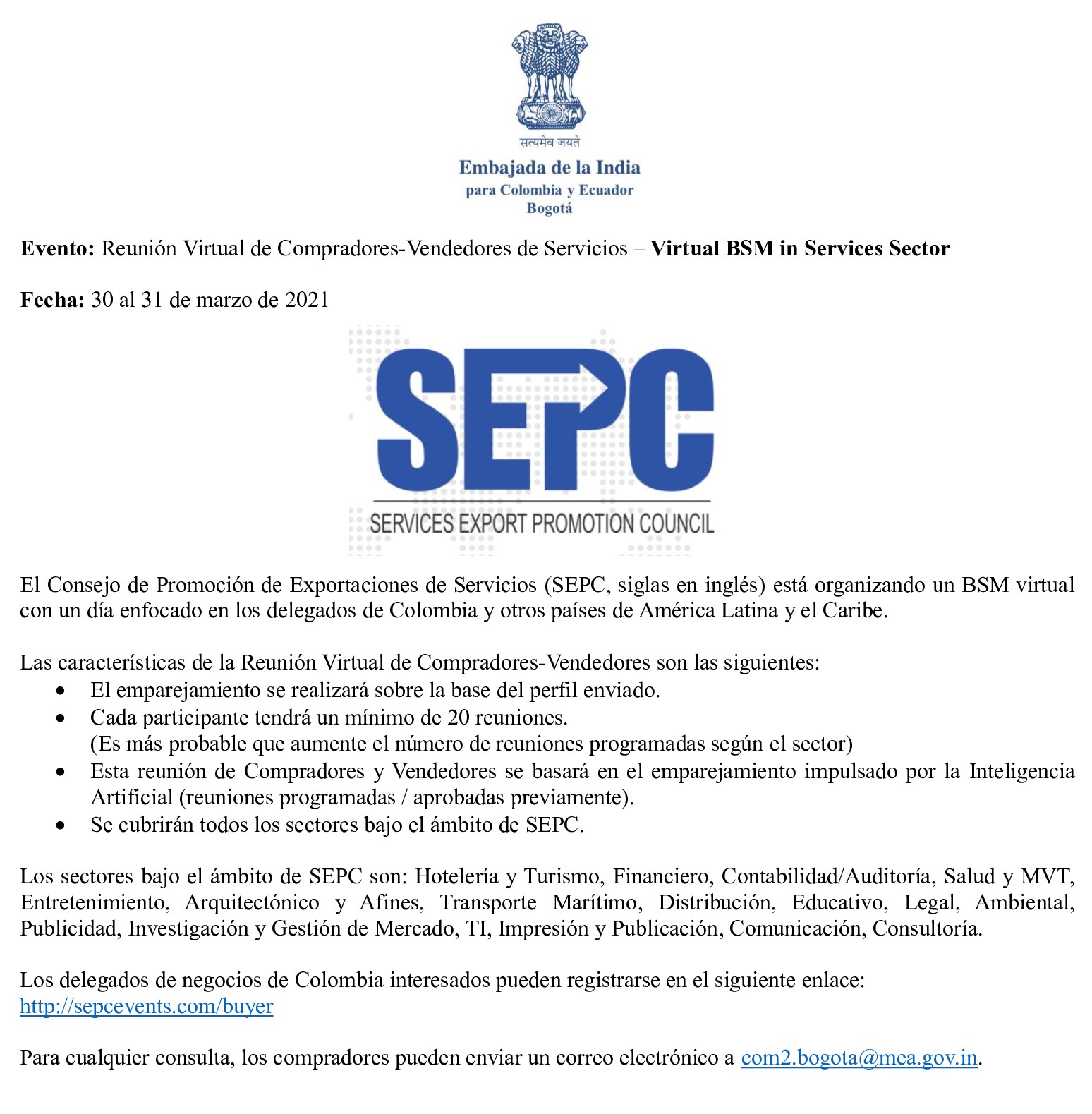 The Services Export Promotion Council (SEPC) is organizing a virtual BSM with a Region-specific day focused on delegates from Colombia and other Latin American and Caribbean countries on 30 – 31 March 2021.